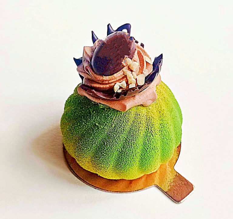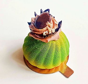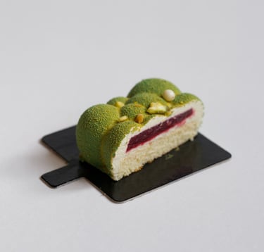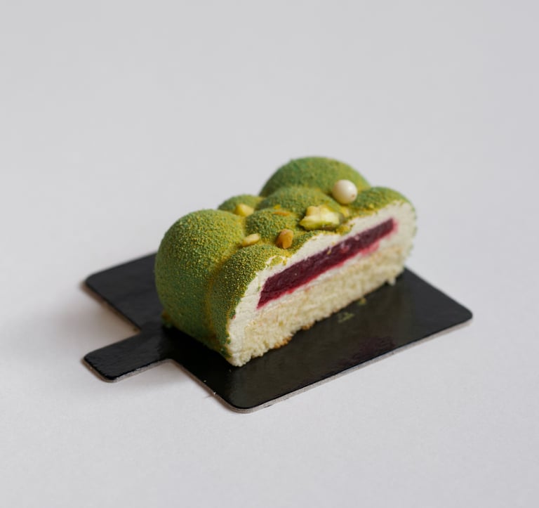 Pistacijų biskvitas, mascarpone sūrio ir pistacijų musas, aviečių confit
