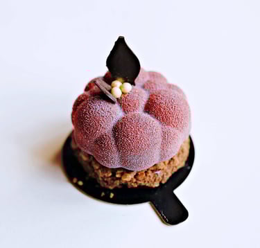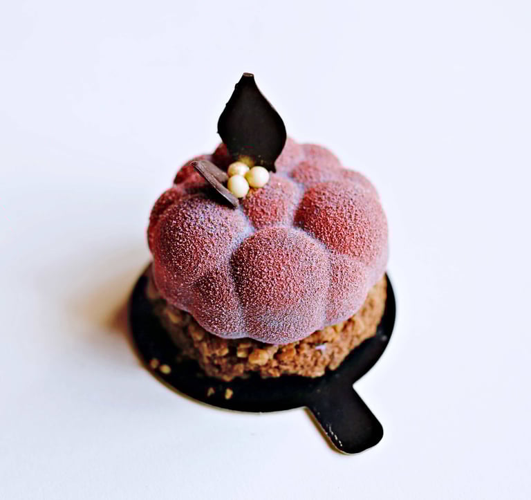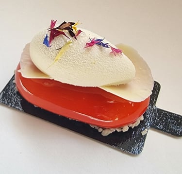 Pfiladelphia sūrio musas su mango gabaliukais, juodųjų serbentų misas, juodųjų serbentų confit, mango compote, lazdyno riešutų biskvitas, aplieta baltu šokoladu