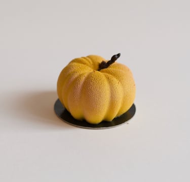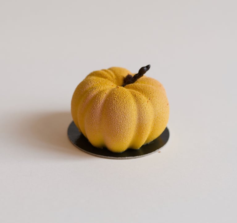 Migdolinis biskvitas, traškus sluoksnis su pienišku šokoladu, mango-pasiflorų compote, mascarpone sūrio ir mango – pasiflorų musas