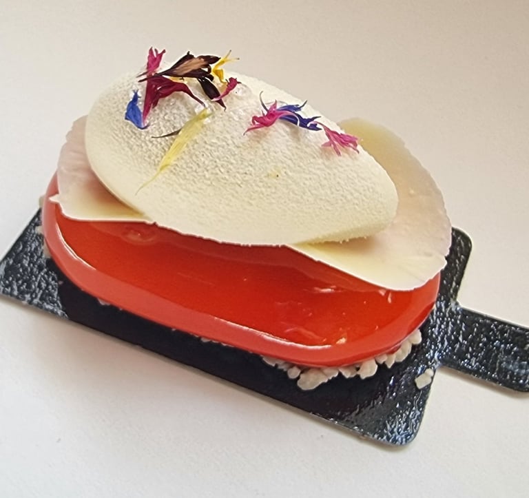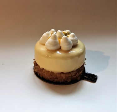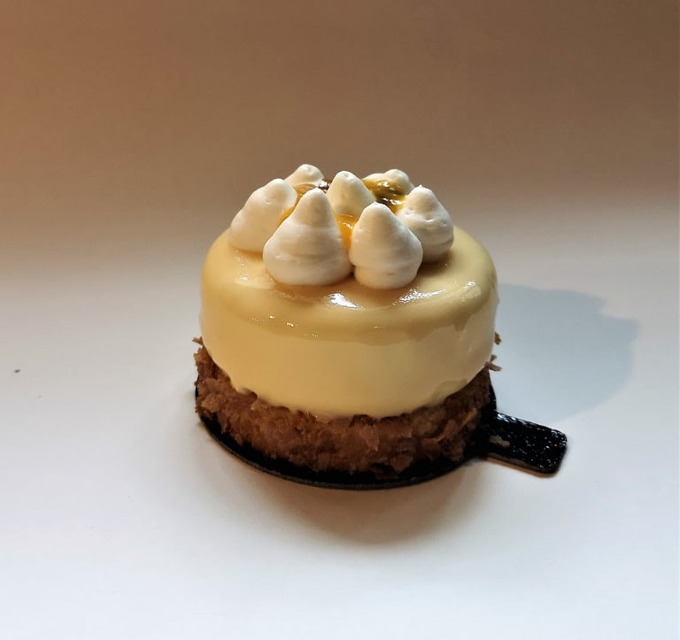 Migdolinis biskvitas, baltojo šokolado ir citrinų musas, mango-pasiflorų compote, baltojo šokolado kremas