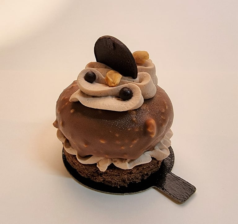 Šokolado ir žemės riešutų musas, sūrios karamelės su žemės riešutais įdaras, šokolado ir grietinėlės kremas, šokoladinis biskvitas