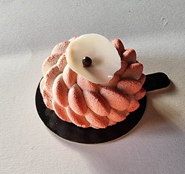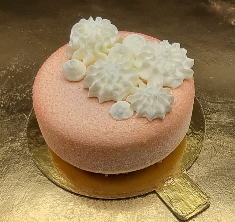 Migdolų biskvitas, aviečių confit, melionų musas. Dekoruota maskarponės ir grietinėlės kremu