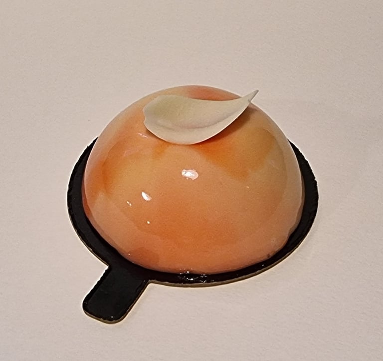 Lazdyno riešutų biskvitas, šaltalankių musas, pieniško šokolado musas abrikosų confit