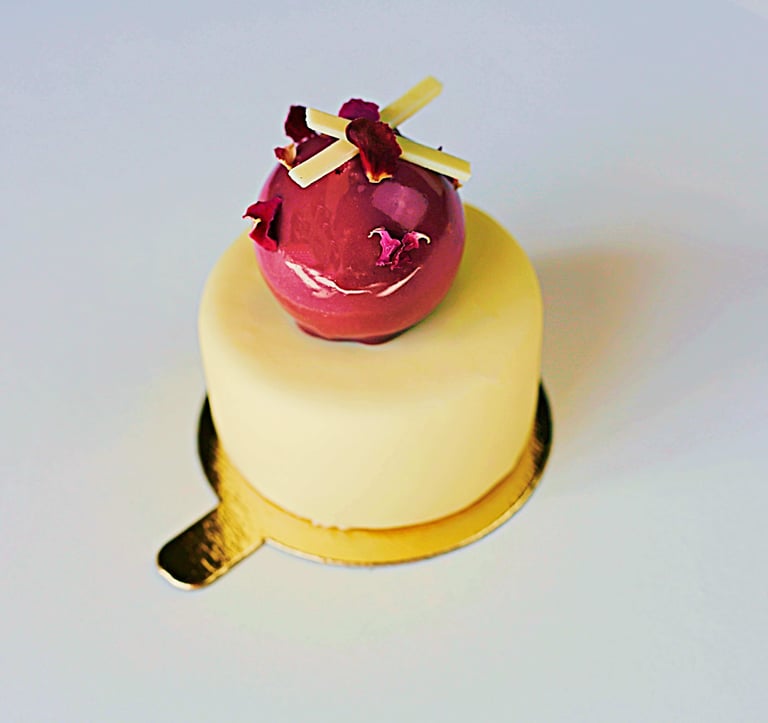 Balto šokolado su citrinomis musas, braškių įdaras, migdolinis biskvitas