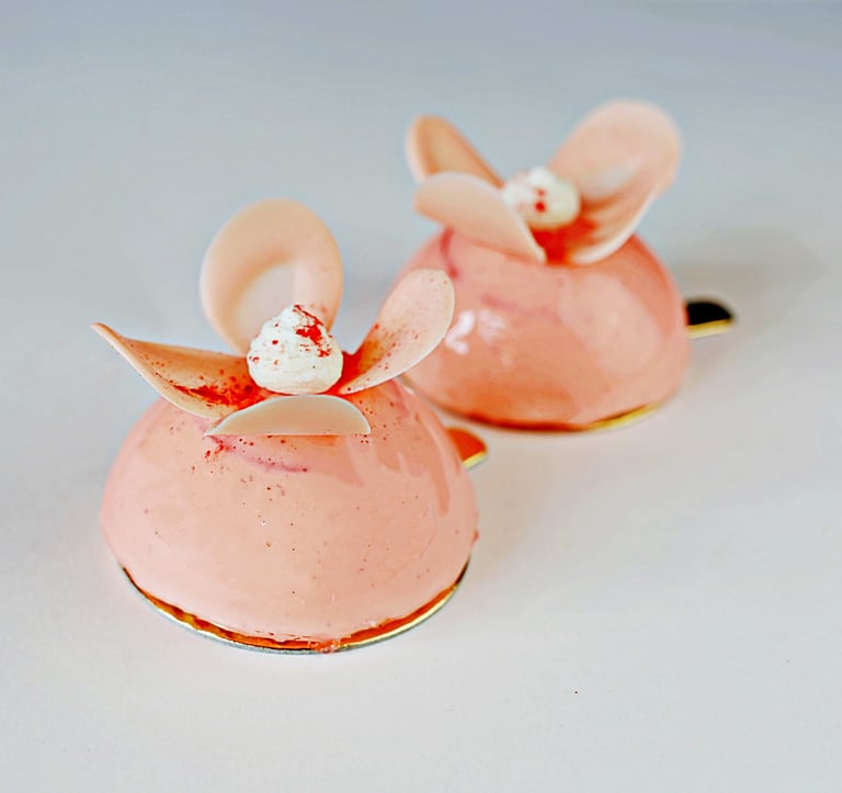 Vanilinis musas su šeivamedžio žiedų sirupu, rabarbarų ir braškių confit, braškių su grietinėle įdaras, pistacijų biskvitas ir pistacijų traškis